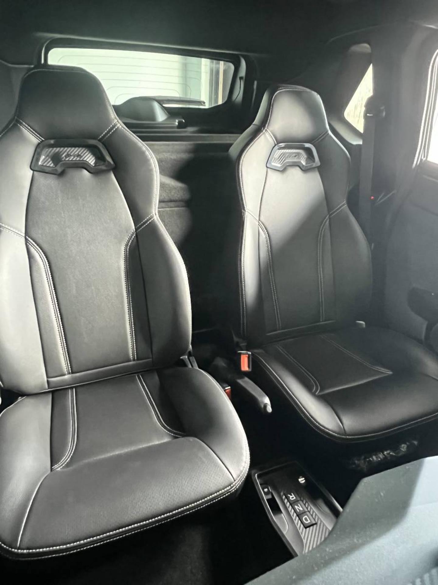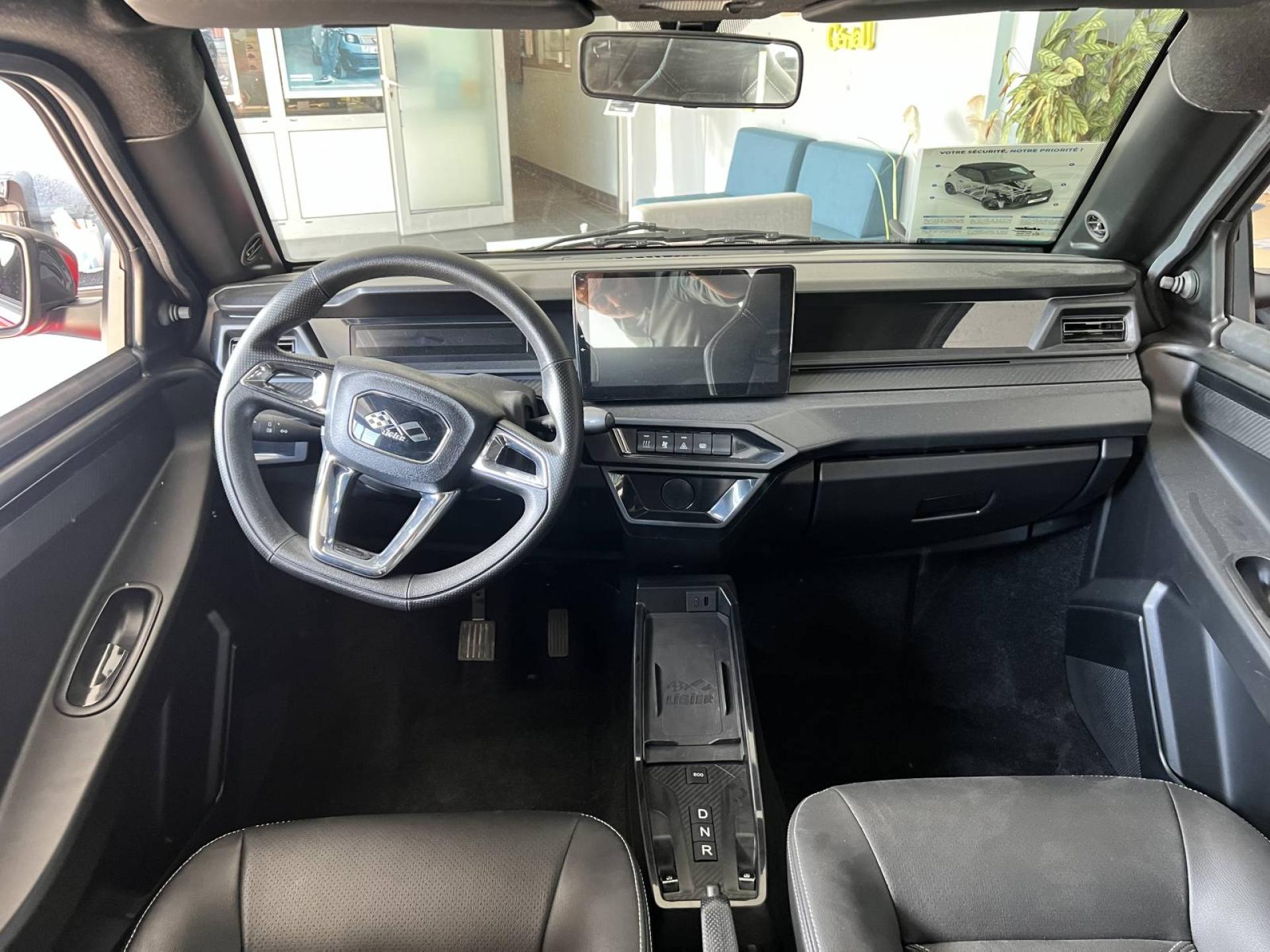 Sièges Premium simili-cuir, surpiqûres ivoires, appui-tête grain carbone et logo Ligier